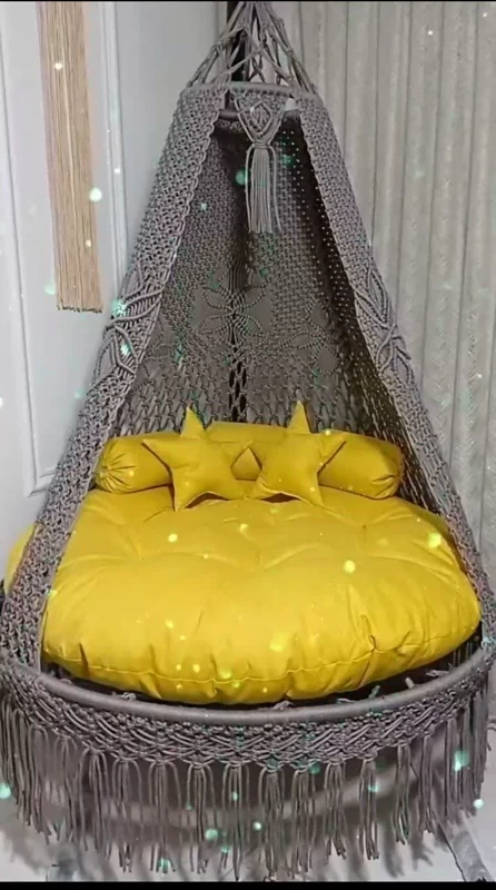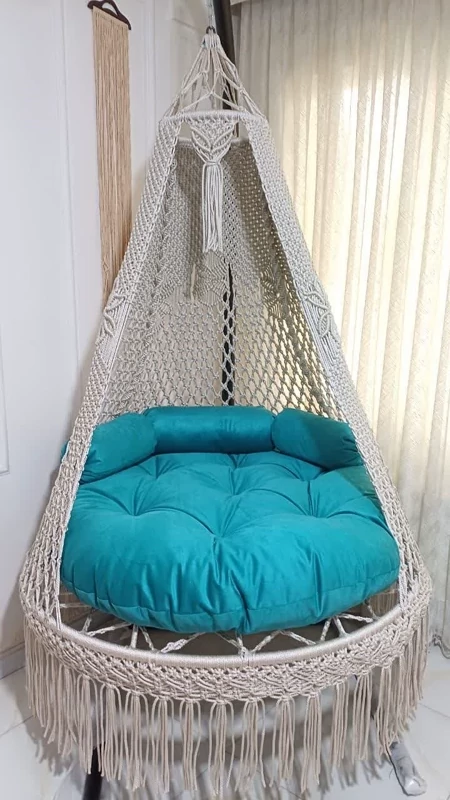 سلام مشتری عزیز تاب ریلکسی دو نفره عربی مکرومه که مشاهده میفرمایید ، مکرومه آن از بهترین نخ والیاف بافته شده است. نخ پلی استر مغزدار شرکت جهان آسا که برخلاف برخی از کارهای بازاری مقاومت بالایی جهت تحمل وزن دارد و تا 180 کیلوگرم را تحمل میکند بدون اینکه به مرور زمان از شکل و ظاهر اولیه خود بیفتد. ارتفاع تاب حدود 220 سانتی متر و قطر کف تاب 130 سانتی متر است. رنگ نخ و تشک تاب به سلیقه شما بر اساس کالیته موجود در اکهی بافته می شود. قیمت تعیین شده در مقایسه با هزینه متریال و تولید با حداقل سود ممکن است به این امید که شما مشتریان عزیز بتوانید با خیالی راحت در منزل خود تاب زیبا مکرومه بافی ما را داشته باشید همچنین مشتریانی که خرید عمده دارند و مشتریان سراسر کشور خریدی به صرفه داشته باشند خدا را شاکر هستیم که بعد سالها فعالیت در تولید انواع تاب ریلکسی رضایت مشتریان را داریم و پیامهایشان موجب دلگرمی مان است بعد از خرید تضمین و پشتیبانی تیم تولید همراه شما است برای سفارش و مشاوره با پشتیبانی سایت تماس بگیرید